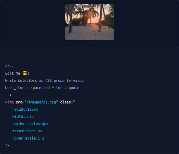 "><!--Edit Me 😎!Write selectors as CSS property:valueUse _ for a space and ^ for a quote--><img src="/images/p1.jpg" class="height:120pxwidth:autoborder-radius:4pxtransition:.3shover:scale:1.1">